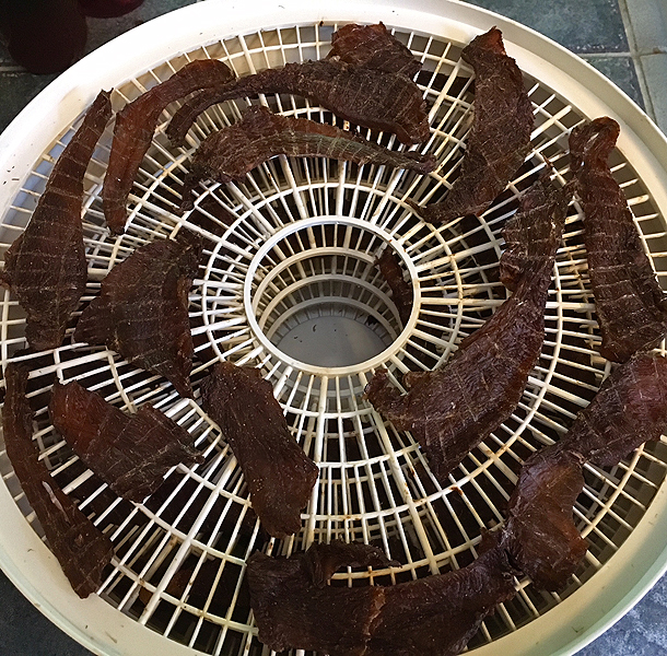 • Lay strips on dehydrator trays, but do not overlap. Turn once while drying (I also switch order