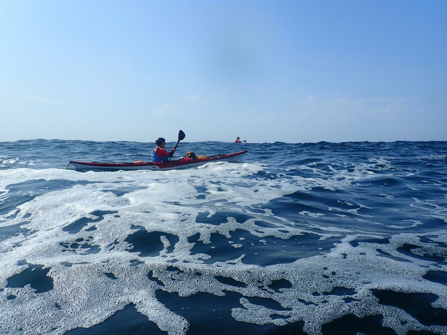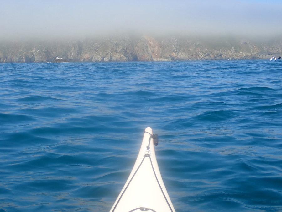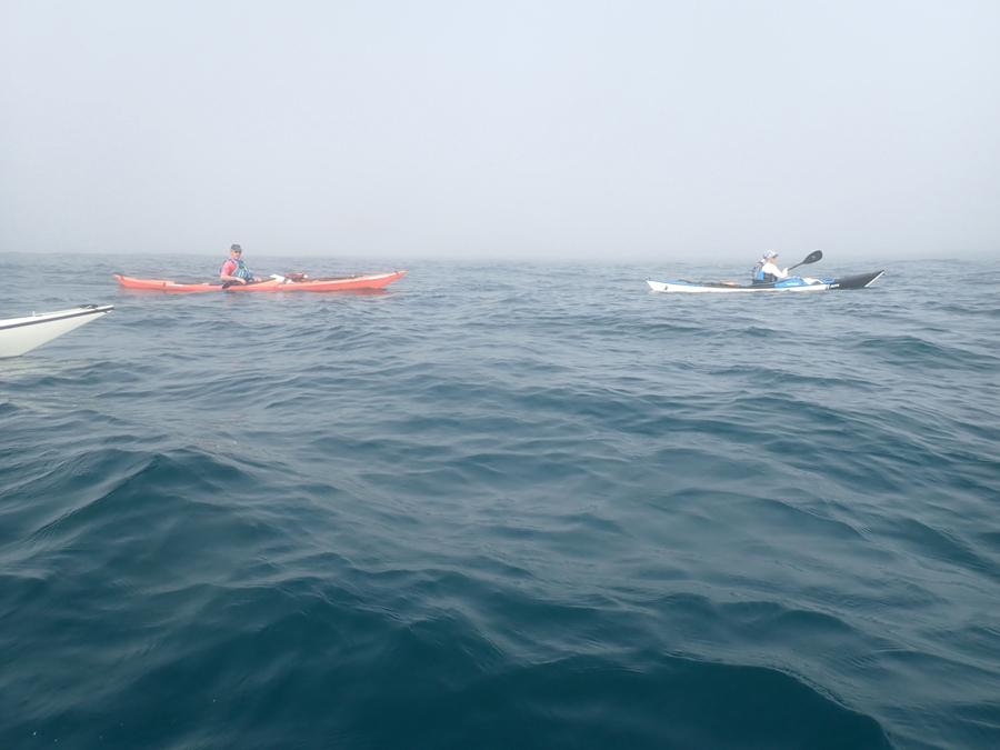 As we headed into the fog we quickly settled into a rhythm, senses tuned into any unusual noises and aware of a building 2 metre swell. I radioed in after 30 minutes and then after an hour. I missed off the welfare report on the second radio call and the Coastguard was immediately back on the radio needing the information on the condition of the group. It would have been so easy to have been flippant and answer that one person had a sore shoulder, another person was feeling slightly menopausal, etc but I resisted the temptation. What was an issue though, was that out of 60 minutes potential kayaking time, 15 minutes had been spent on the radio!