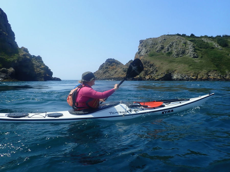 Jersey, the largest, is my island home. Large is a relative term as it is only 9 miles long and 5 miles wide. Within this compact 45 square miles, there is some dramatic coastal scenery, set against a rich historical background, which stretches back approximately 240,000 years. The kayaking is made all the more interesting by the twice daily rise and fall of the tide, with a tidal range which reaches 12 metres on the larger springs.
