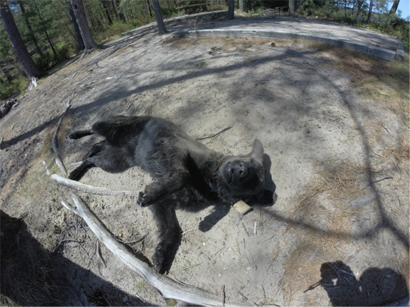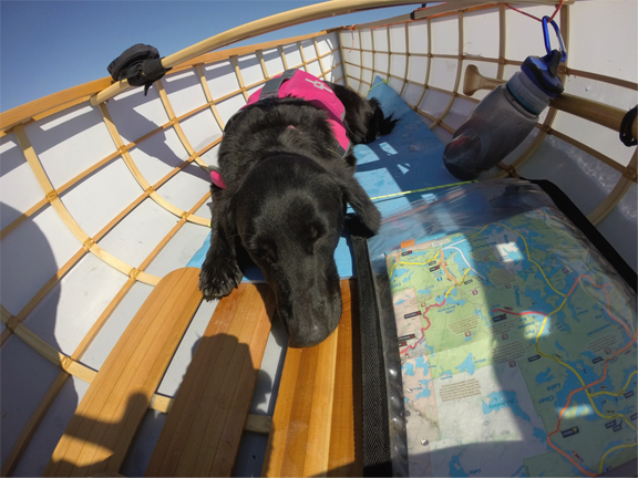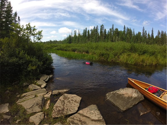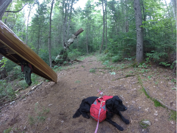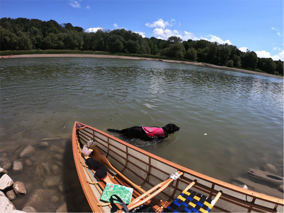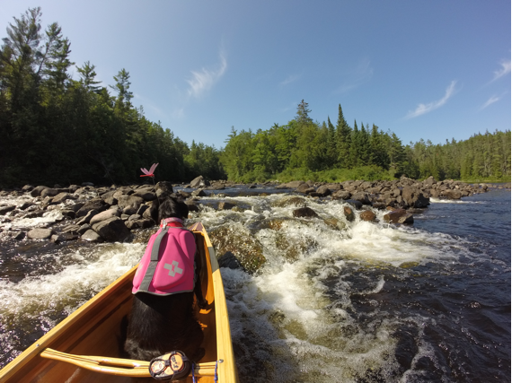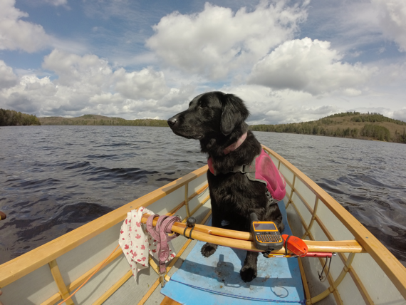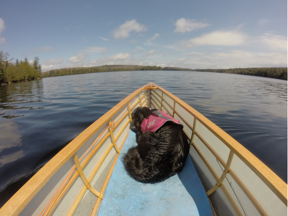 Not good with a black coat. I make sure we stop to allow her to go for a swim to cool down. One last swim before jumping in the canoe will keep her cool for a while. Also, a few “opps, sorry Willow, bad back stroke”, getting a fresh layer of water on her. She also sticks her nose way in the bow to get in the shade and away from any bugs. I have also thrown a wet towel or my hat on her. Some peeps like Kevin Callan suggest a umbrella, but during windy days, it does make it hard to set up and if no tail wind, hard to stay on coarse.
