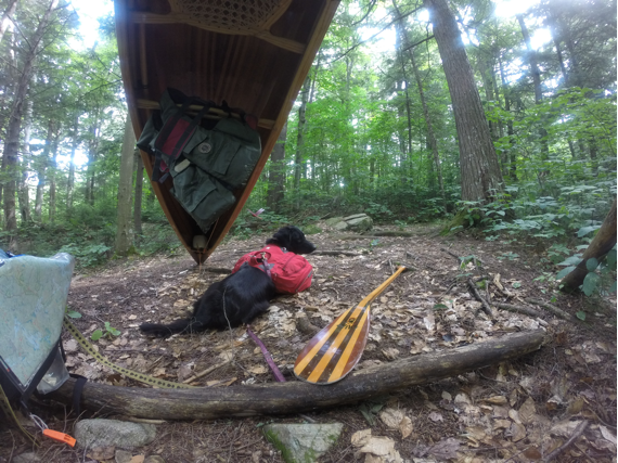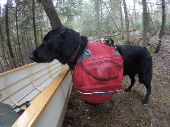 Once l land shore, I make sure to give command “out canoe”.  There is times when she is eager to get out before I give the command and jumps out at not the best time, getting wet.  If no one is around, I leave her off-leash.  She is timid and does not leave my side very far. Provincial Parks, dogs to be on leash at all times. On portages I will leash her tied to my belt, staying in front of me. She pulls lightly helping me uphill, but when I go thru a muddy, rocky areas, it does not help me keep vertical. One portage I carried across a rocky stream, I went down with canoe and pack as she caused me to go off balance. So, after that spill she went off leash! She stays in front of me and stays on trial. If I see people come, I call her back and will leash her up and/or ask approaching people if they mind dogs. I have met some that asked me to make sure dog is on leash. No problem.  My other dog would approach strangers and try to make friends with some licks. Not good at all on portages. Willow will give a bark if someone is coming and runs back to me.