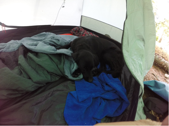 She loves going in the tent. I bring her canoe pad in the tent and “try” to keep her on it. She may try to come over to see me during the night. I bring a drying tower for her in case she is wet before going in the tent.