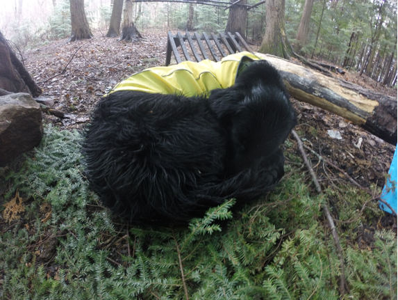 Pen Lake, Algonquin Park. Made use of bows from a down tree make a nice bed for her. Never cut live trees!