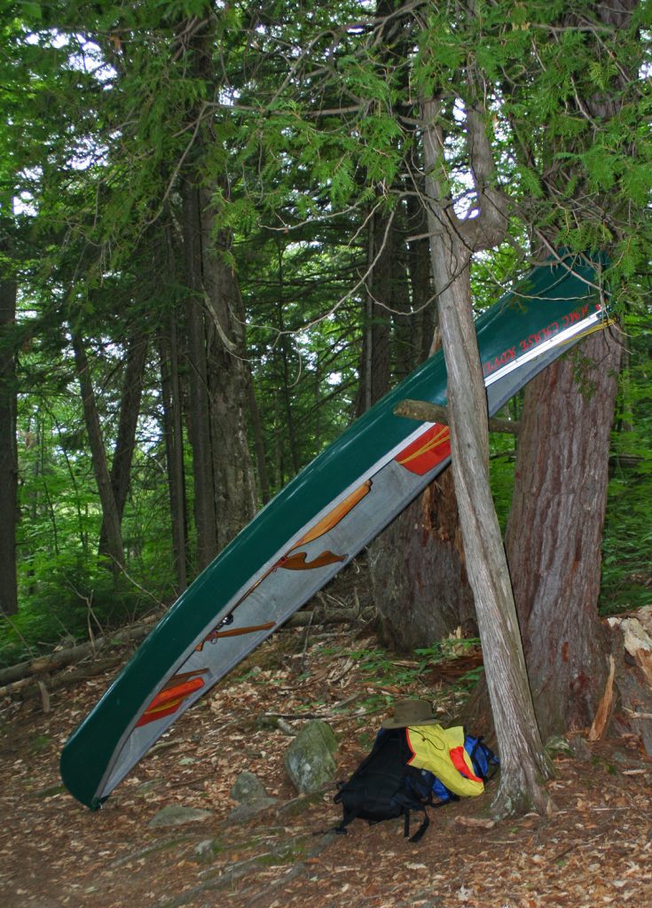The big green beastie on a canoe rest along a portage